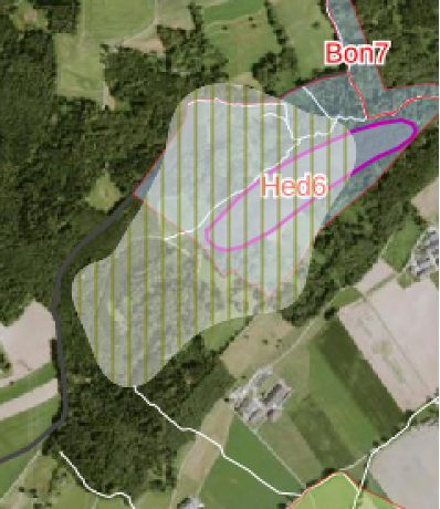 Himelsbüel: betroffen ist die Hälfte des Eignungsgebiets Würmeiszeitliche Seitenmoräne Ottenholzbau und Soltobel (Objekt Nr. Bon 7 / Hed 6) Bedeutung: Zusammen mit de Moränen Hirslen und den Bonstetter Endmoränen lässt sich die Ausdehnung des Ämtler Astes des Reussgletschers lückenlos rekonstruieren. Die Moräne Ottenholzbau und das Soltobel sind zudem ein typisches Beispiel, wie die Landschaft unter zwei verschiedenen Klimaten geformt werden kann, nämlich durch den Gletscher in der Eiszeit und durch das fliessende Wasser im gemässigten Klima. Dieses Objekt ist deshalb bedeutend. Massnahmen: Keine Durchbrüche und Abtragungen an der Moräne. Keine Bachbegradigungen. Verbauung an den Tobelhängen haben auf das Relief Rücksicht zu nehmen. Link zum Objektblatt mit genauer Beschreibung:https://maps.zh.ch/system/docs/aln_fns/geomorph/objektblaetter/Hedingen6.pdf | ![]() |